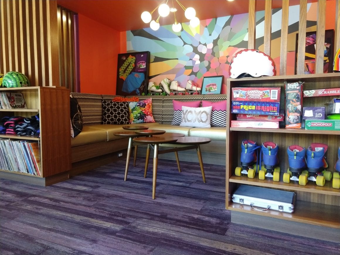 As we approached Kelowna, the sky began to darken, and just as we pulled into town the rain began to pour down again. We quickly researched hotels online. With no campground lined up and a torrential downpour underway, we were ready for a hotel. We settled on the Hotel Zed, and were able to make a reservation online shortly before we got to it. It’s right downtown near Okanagan Lake, across from the City Park. The hotel is cool retro restyle of a, probably, cheap motor lodge. The room comes with comic books, and ear plugs (apparently it can be noisy). There’s a game room with ping pong, games, a turntable and a bunch of records. There are bikes, inline skates, and skateboards, available for guests to use. There’s also a hot tub, and a small pool.