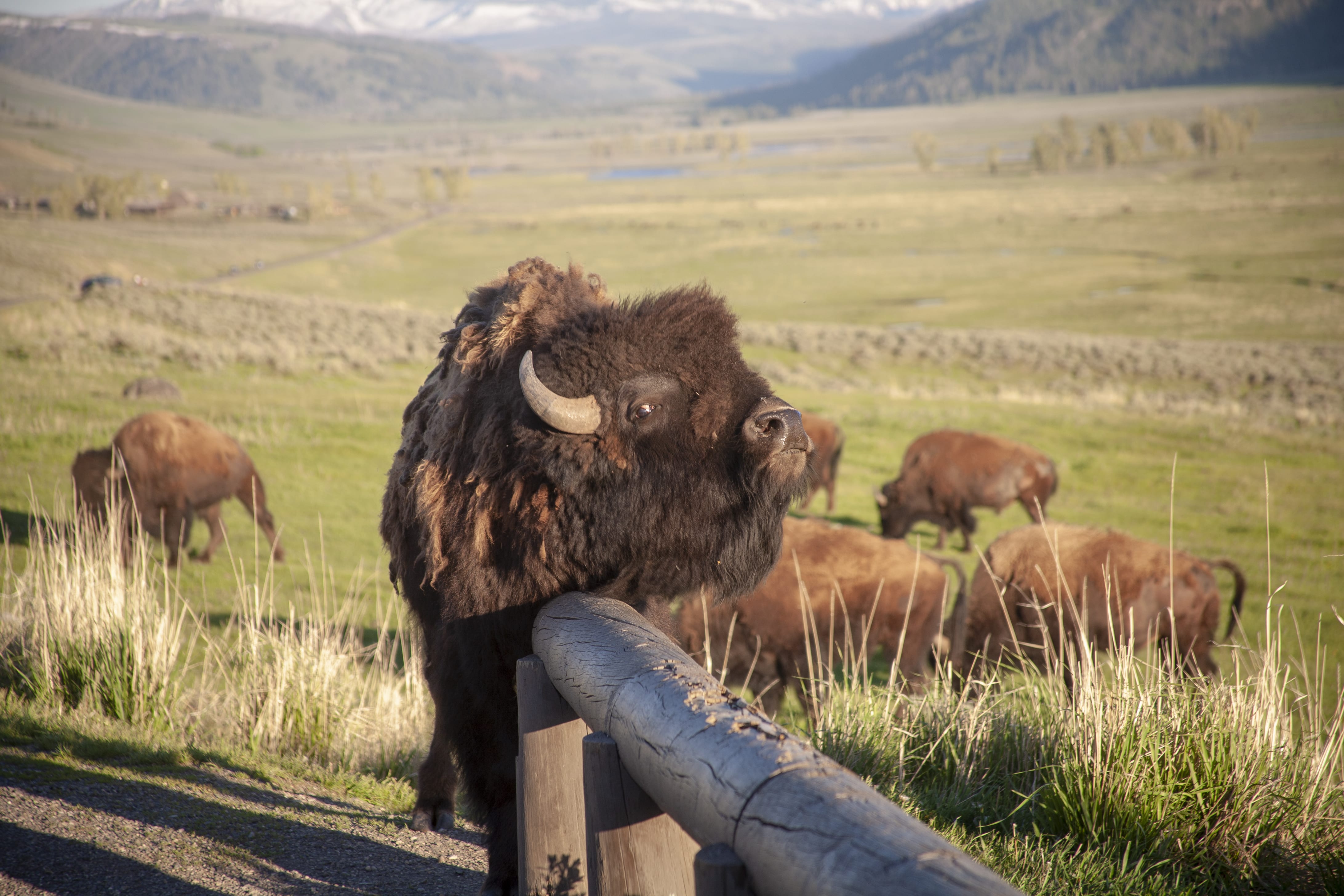 While parked-in in a pull over in the Lamar Valley, we had a very close visit by a bison. This made Alexander very nervous, as it was on his side of the van. Fortunately, we were smart enough to stay in the van, and not hang out the window, or otherwise antagonize the bison. It just wanted to scratch it’s head on the wood parking rail.